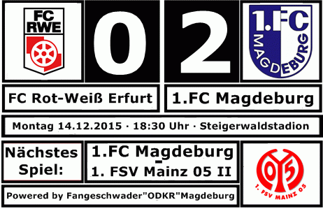 ![]() Na Endlich 1.AUSWÄRTSSIEG Rot-Weiß Erfurt - 1.FC Magdeburg 0:2 Tore: 0:1 Brandt(8.) 0:2 Beck(14.) Zuschauer:7069 |