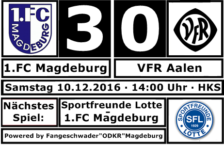AUSWÄRTSSIEG !!! 3 Punkte mehr auf dem Konto FSV Frankfurt vs 1.FC Magdeburg 0:1 Tor:0:1 Düker(19.) Zuschauer:4028 ![]() HEIMSIEG !!! Und Hallo Tabellenplatz 3 1.FC Magdeburg vs VFR Aalen 3:0 Tore: 1:0 Müller(6. Eigentor) 2:0 Schwede(39.) 3:0 Ernst(59.) Zuschauer:12.622 ![]() https://www.facebook.com/ODKR2000/videos /1490935797586458/ |