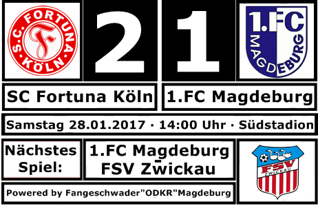 Köln liegt uns einfach nicht... SC Fortuna Köln vs 1.FC Magdeburg 1:2 Tore:1:0 Oliviera Souza(23.) 1:1 Schiller(25.) 2:1 Mimbala(66.) Zuschauer:3.076